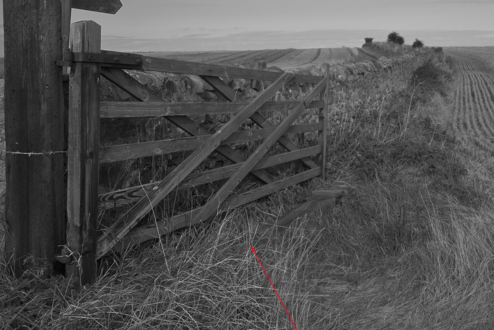 Here an image has been processed at USM values of 50:50:0 and the top right masked off to show the original. You can see that the bottom left is darker, has a significant halo around the top of the post but also improved textural rendering in the gate.