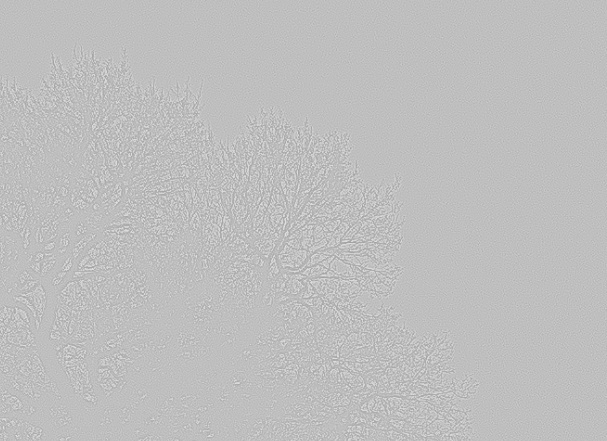 e) Holding down the ALT key while moving the masking slider shows the size of the items being sharpened; here you can see major branches are sharpened but small twigs are not. From the speckles in the sky you can also see that some sharpening is being applied to noise in the sky. It may be preferable to ease back on the other settings or increase the masking. This noise was not visible in an A2 print but would show if a large poster were produced.